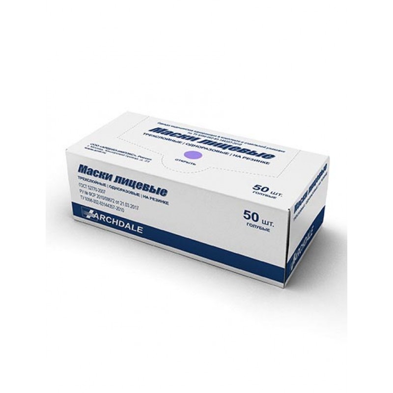 Маска лицевая трехслойная на резинке голубая Archdale 50 шт/уп