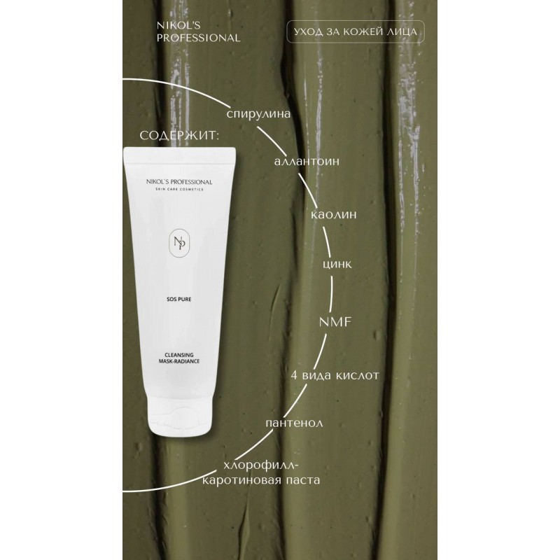 Cостав(INCI):Aqua, Kaolin, Sesamum Indicum Seed Oil, Glyceryl Stearate, Glycerin, Cetearyl Alcohol, Ceteareth-20, Spirulina Maxima Powder, Chlorophyll-Carotene Paste, NMF, Zinc Oxide, SC-CO2 Hypericum Perforatum Leaf Extract, SC-CO2 Echinacea Purpurea Extract, Allantoin, Sulfur, Panthenol, Xanthan Gum, Tocopheryl Acetate, Phenoxyethanol, Parfum, Sodium Ascorbyl Phosphate (SAP), Polysorbate 20, Lactic Acid, Citric Acid, Malic Acid, Salicylic Acid, Bisabolol, Disodium EDTA, BHT.