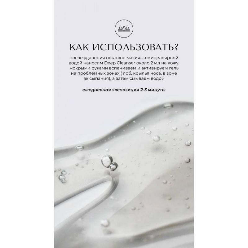 Эффективная формула на основе гликолевой, салициловой и азелаиновой кислот глубоко очищает поры, регулирует выработку себума и предотвращает появление высыпаний.